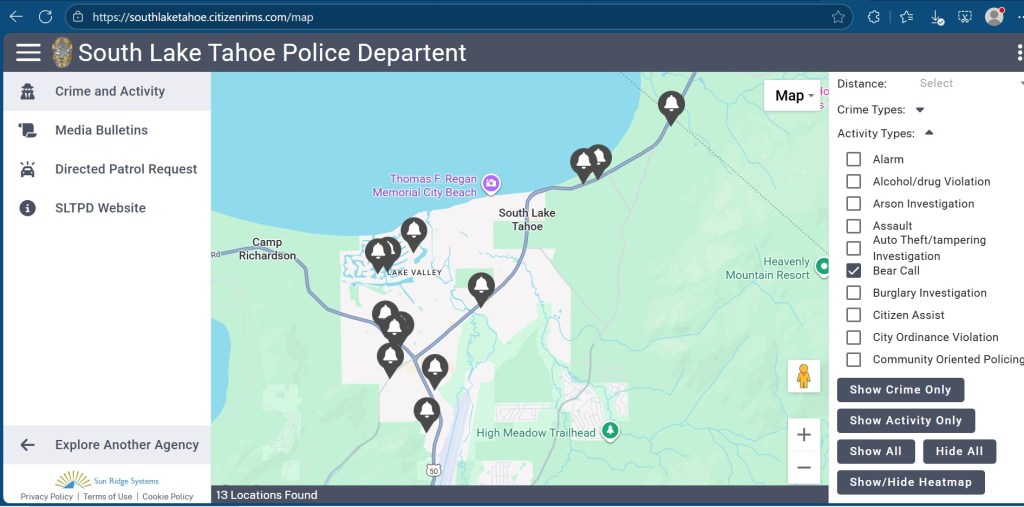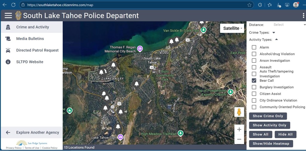 If you want to see bear incidents in your neighborhood, first select Activity Type and then check only the box for Bear Incidents. The SLTPD Bear Incident Map is available at: South Lake Tahoe Police Department
